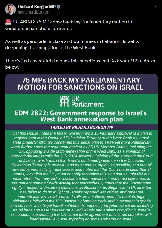 The motion condemns the annexation of Palestinian territories in the West Bank and calls for concrete measures, including an arms embargo, a ban on trade with Israeli settlements, economic sanctions, and individual sanctions against Israeli officials. Burgon has called for the motion to gain even more support in the coming weeks.