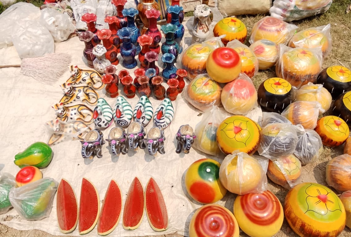 Bikash Chandra Pal, a potter from Syedpur Charpalpara, sits among a collection of clay items in a corner of the fair. Expressing his views, Bikash said, Sales are sluggish at the moment. It is expected that the number of buyers will increase on the last two days of the fair. Many people do not want to buy these things now because the price of clay products is high."