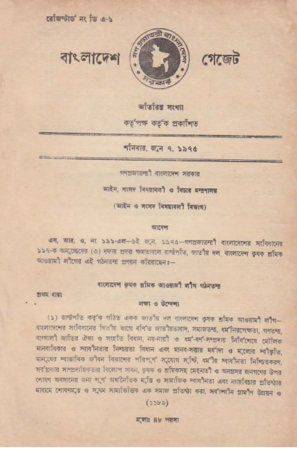 Political scientist Rounaq Jahan writes, “Immediately after independence, a debate began over the politics and governance model favored by the Awami League leadership. While most people believed the country should have a parliamentary democracy based on a competitive multi-party system, some youth and student leaders of the party, such as the Rab-Siraj group of the Chhatra League, began demanding the formation of a revolutionary government under the personal rule of Sheikh Mujibur Rahman. Another faction of the Chhatra League (Siddiqui-Makhon) began idolizing him, and they renamed the four fundamental principles of the Constitution—nationalism, democracy, socialism, and secularism—as ‘Mujibism.’ The party’s youth wing, the Awami Jubo League, founded in November 1972 by Sheikh Mujib’s nephew Sheikh Fazlul Haque Moni, and the labor wing, the National Workers League, called for the dissolution of parliamentary democracy and the establishment of a revolutionary government under the leadership of the Father of the Nation. Sheikh Moni repeatedly called for a ‘Second Revolution’ through his public speeches and publications, claiming that the people would benefit from direct rule under Sheikh Mujib.” (Rounaq Jahan, Political Parties in Bangladesh, Prothoama/2015, p. 20)
