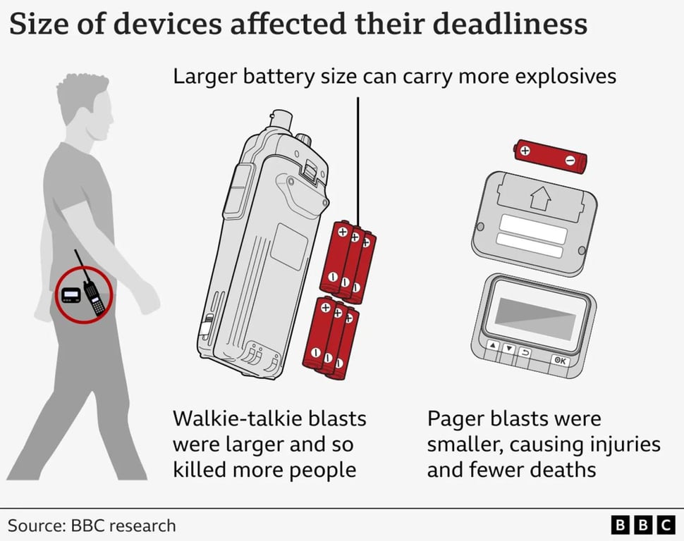 The size of the devices affected the severity of the explosions. Larger devices like walkie-talkies could carry more explosives, leading to more powerful blasts and higher casualties. Pagers, being smaller, caused less destruction but still led to serious injuries and deaths. This discrepancy in device size allowed for a wide range of impacts, with some blasts causing large-scale damage and others being more localized.