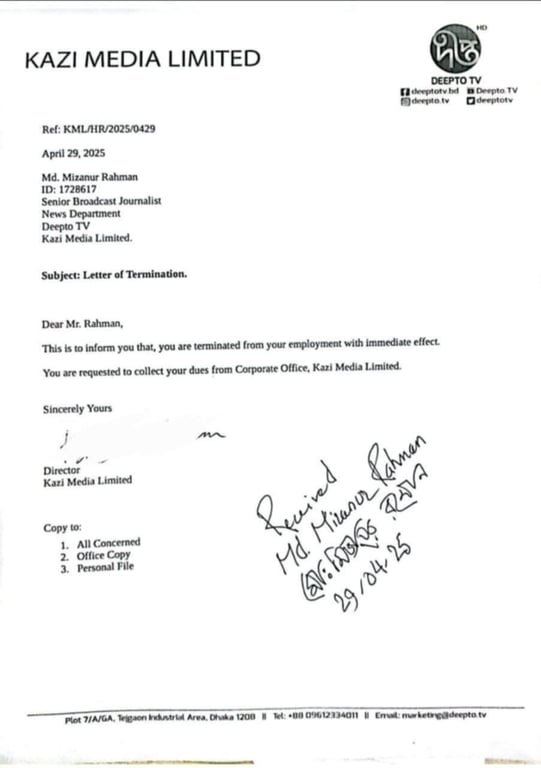 Mizanur Rahman of Deepto TV and Fazle Rabbi of ATN Bangla were dismissed, but the reasons for their termination were not clearly stated. Normally, when a journalist is dismissed for misconduct, they are first given a notice to explain themselves, and if the explanation is unsatisfactory, further action is taken. However, in this case, no explanation was provided for the dismissals, which violates both institutional policies and labor laws.