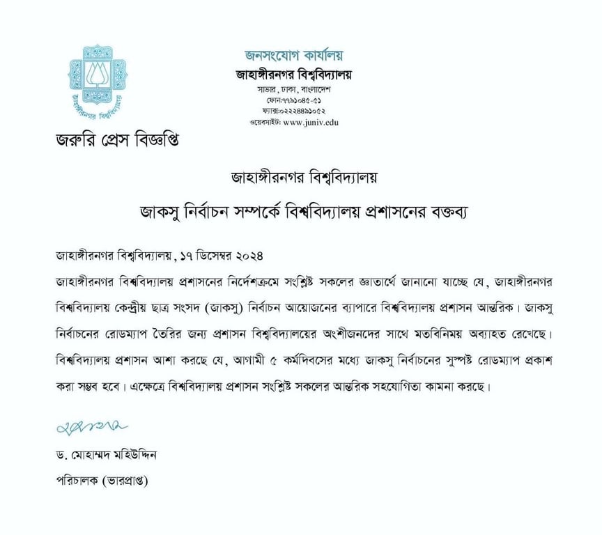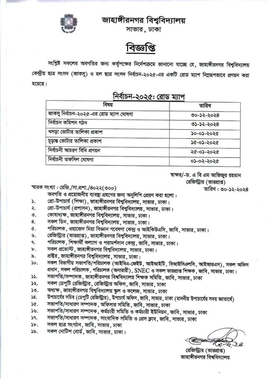 The university administration has released the much-awaited roadmap for the Central Students' Union (JUCSU) elections of Jahangirnagar University. On Monday (December 30), the roadmap for the JUCSU elections was released through a notification signed by Jahangirnagar University Registrar (Acting) Dr. ABM Azizur Rahman.