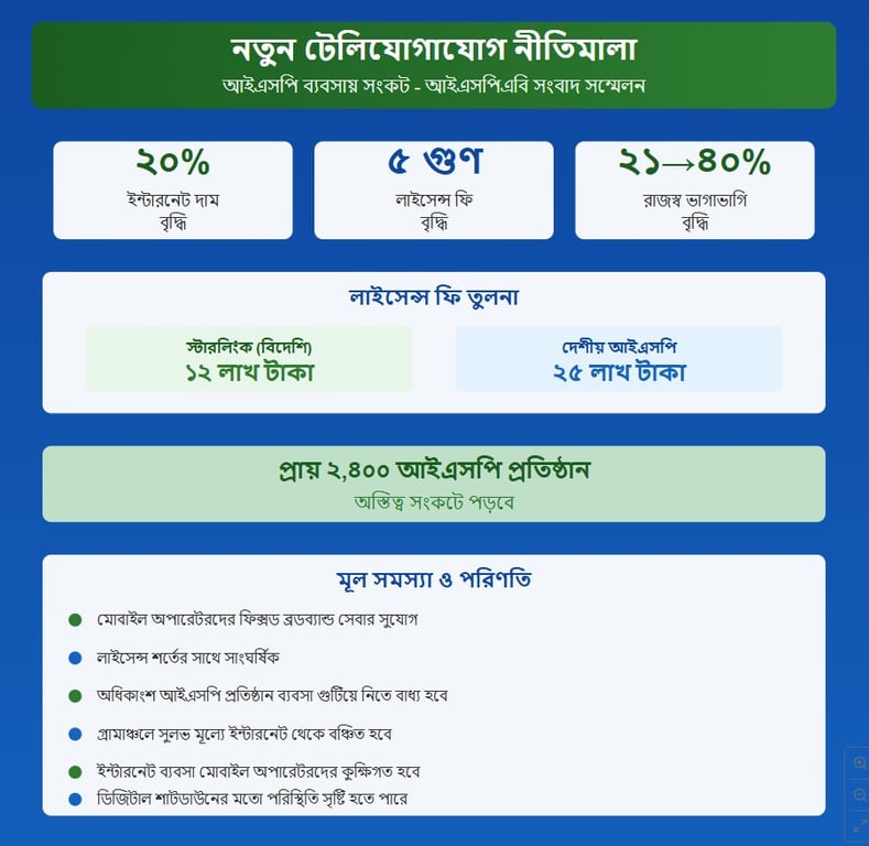ISPAB president said that the draft policy has provided the opportunity for mobile operators to provide fixed broadband services directly through fiber optic cables. This is in conflict with the terms of the license given to them. Because the definition of the license clearly states that they will provide 'cellular' services specifically. That is, their services will be only radio wave-based mobile telecommunication services. They cannot provide any services through cables under any circumstances. By providing the fixed broadband services of mobile operators, about 2,400 ISP companies established by domestic entrepreneurs are being thrown into a crisis of existence. He said that reading the draft policy, it seems that "mobile operators are bigger than the country". Because the draft policy has given importance to expanding new business areas and protecting the interests of mobile operators only. At the same time, the license acquisition and renewal fees have been increased by about five times for all categories of ISP companies. The amount of revenue sharing with the government has been increased. Allocation to the social responsibility fund has been made mandatory. As a result, if this policy is implemented, the amount of money paid by IACP operators to the government will increase to 40 percent instead of the current 21 percent. As a result, most ISP companies will be closed and the internet business will become the pocket of mobile operators.