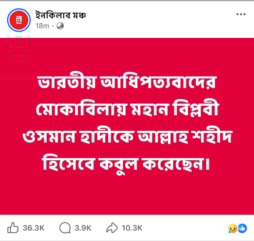 The post said: "Allah has accepted Osman Hadi, the great revolutionary in confronting Indian hegemony, as a martyr."