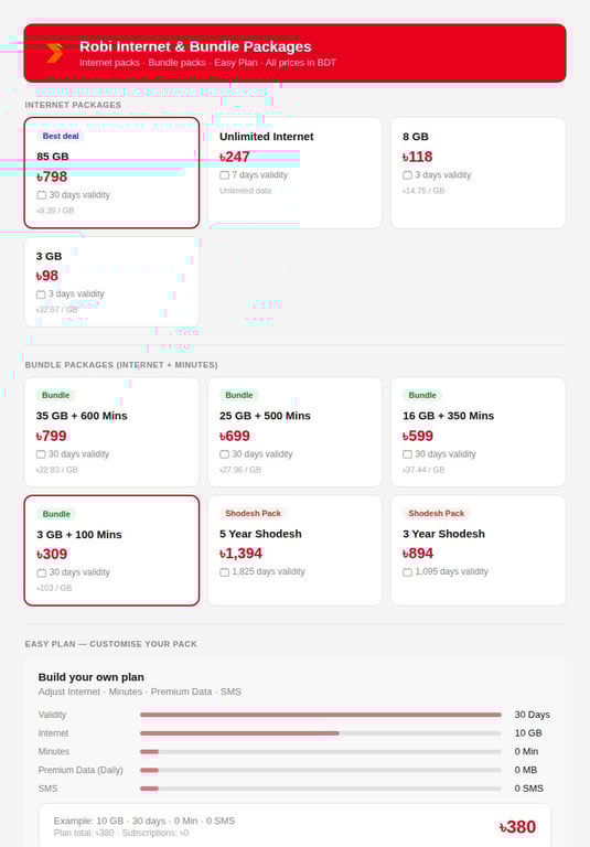 Similarly, the current number of Robi Axiata Limited subscribers is 57.24 million. Out of this, the number of mobile internet subscribers is 34.34 million. Out of this, the number of 30-day package subscribers is about 13.737 million. According to Robi's open internet package and Easy Plan, the minimum price of a 30-day package is Tk380. Thus, if we calculate the additional cost of Tk80 for each of the 13,737,600 customers, the total additional cost in 12 months stands at Tk1,318 crore. Robi's generally open internet package offers only one option for a duration of 30 days, which includes 85 GB of data for a cost of Tk798. In the bundle offer, the minimum price for 3 GB of data along with 100 minutes of voice calls is Tk309 for a 30-day period.