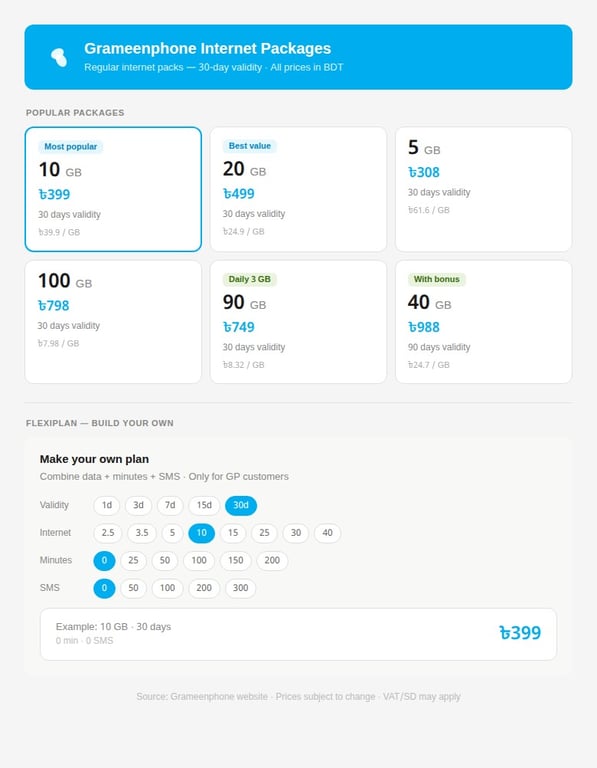 The price of 10 GB package of the country's leading mobile operator Grameenphone is currently Tk399 for a period of 30 days. As it appears in the list of standard packages, the cost of internet services is also established in the Flexiplan at the same rate. Nevertheless, there are variations in bundles (packages that combine internet and voice calls) and tailored packages based on the customer's spending habits. The extent of this variation is minimal; for instance, the price for 10 GB of data over a 30-day period in the package available to all customers is Tk399, which serves as the primary reference point.